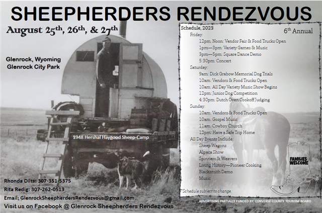 Come out for some old fashioned fun at the Sheepherders Rendezvous August 26-28th at the town park in Glenrock, Wyoming. For more information contact Rita at 307-262-0513 or check out the event website HERE. |